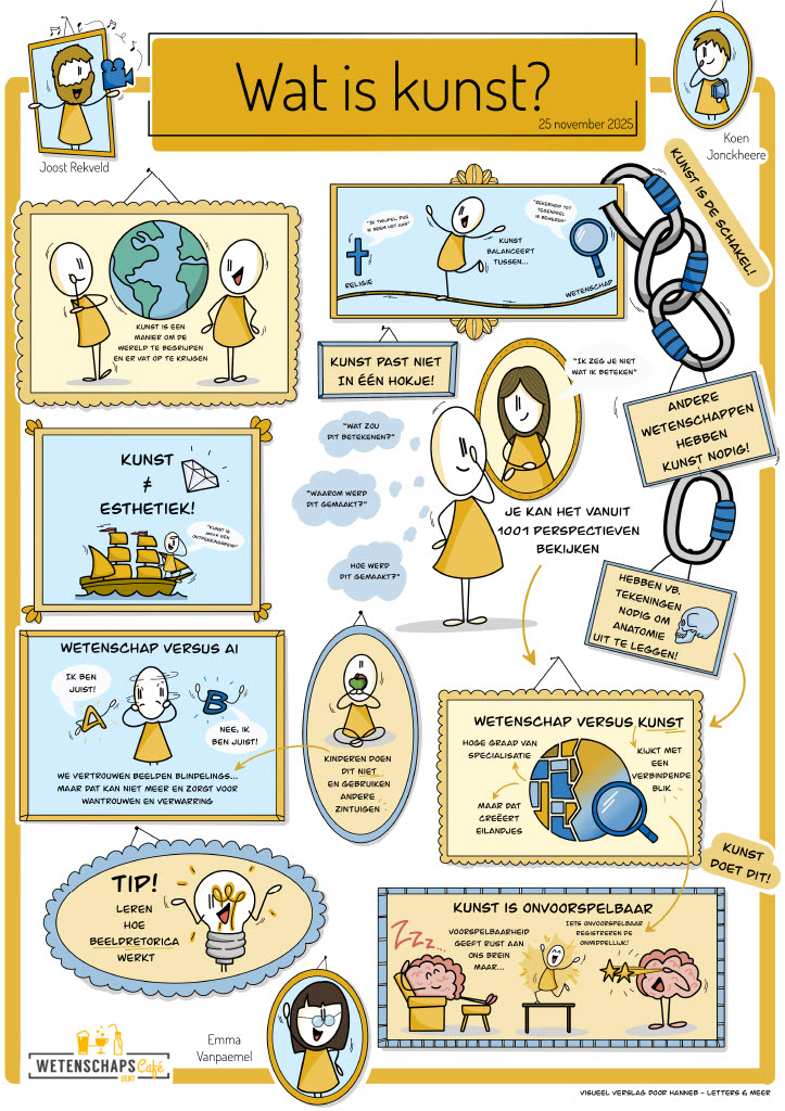 Herbeluister de podcast, herbekijk nadien het Wetenschapscafé via Youtube of bewonder de hoogtepunten in het visueel verslag.